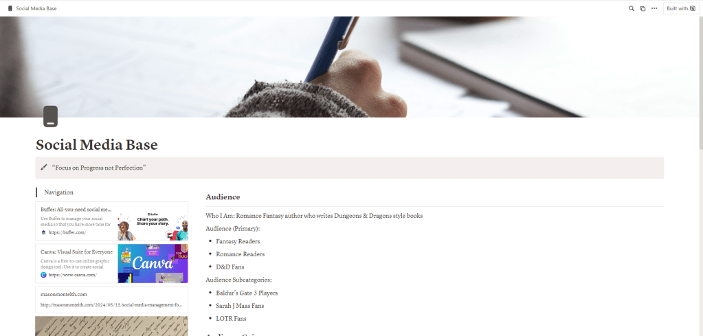 When I tell you Notion is a lifesaver, I mean it! I use Notion for everything. Notion is a workspace that can be used to organize work, school, etc. You can find a ton of templates online and just copy them to your Notion page, or create a social media manager from scratch. I use Notion to keep my social media goals, post ideas, completed posts, blog posts, and more all in one place.